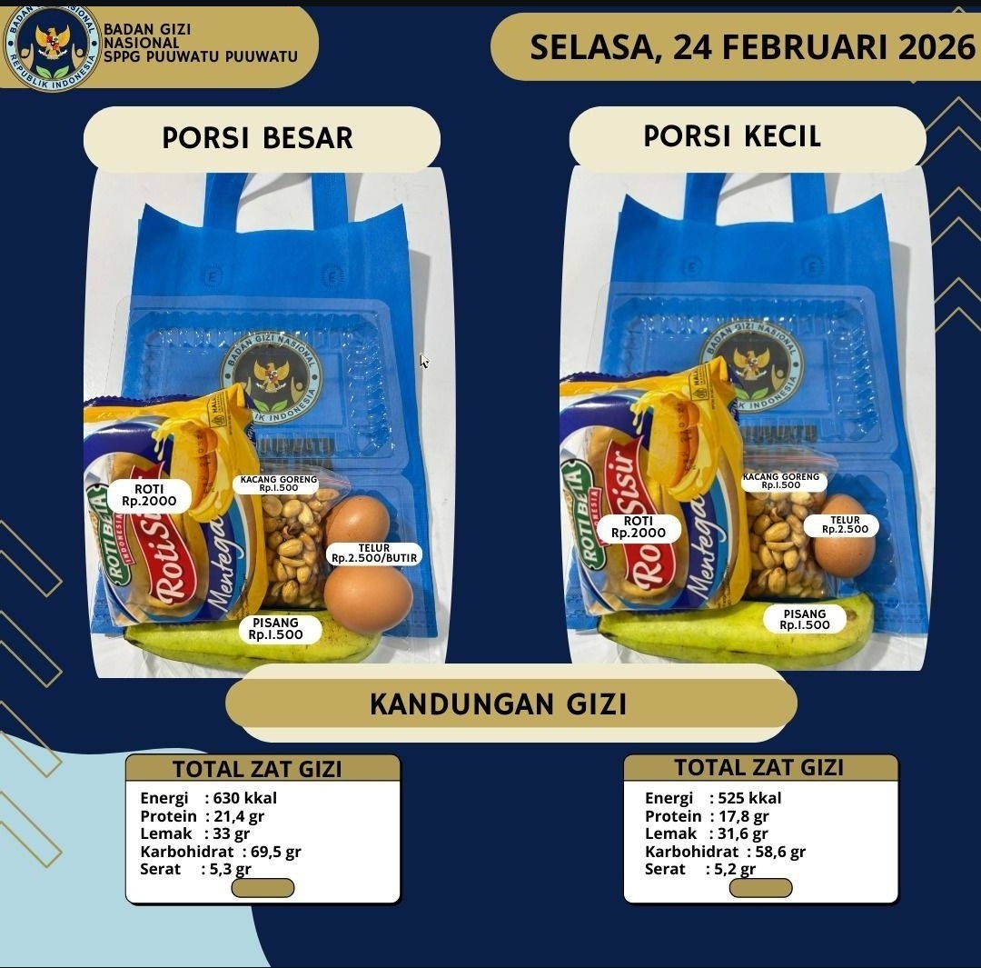 SPPG Puuwatu juga memaparkan kandungan zat gizi dari masing-masing porsi untuk memastikan kebutuhan masyarakat terpenuhi: