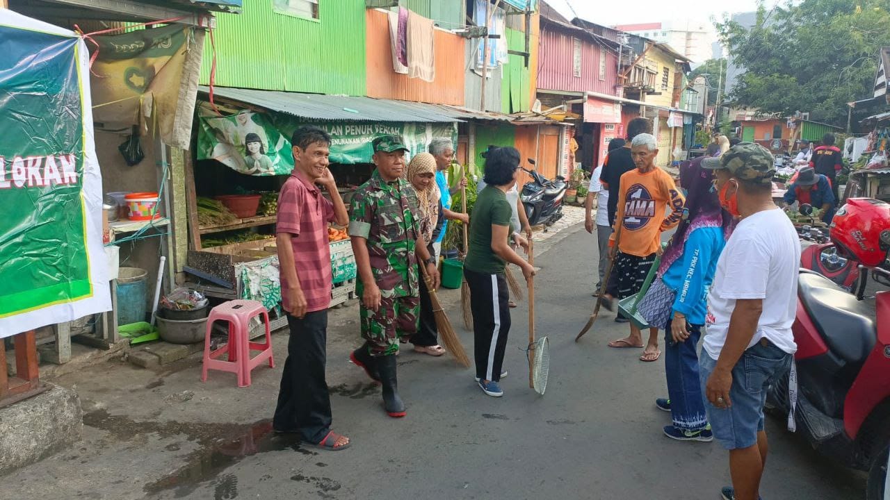 Dalam kegiatan tersebut terlihat aparat TNI bersama warga membersihkan sampah di lorong permukiman, menyapu badan jalan, serta menata lingkungan sekitar fasilitas umum dan area pasar.
