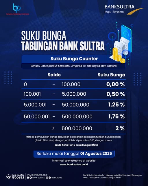 Bank Sultra juga menjelaskan bahwa metode perhitungan bunga tabungan akan tetap didasarkan pada perhitungan bunga harian. Rumus yang digunakan adalah: Saldo Akhir Hari x Suku Bunga x 1/365.
