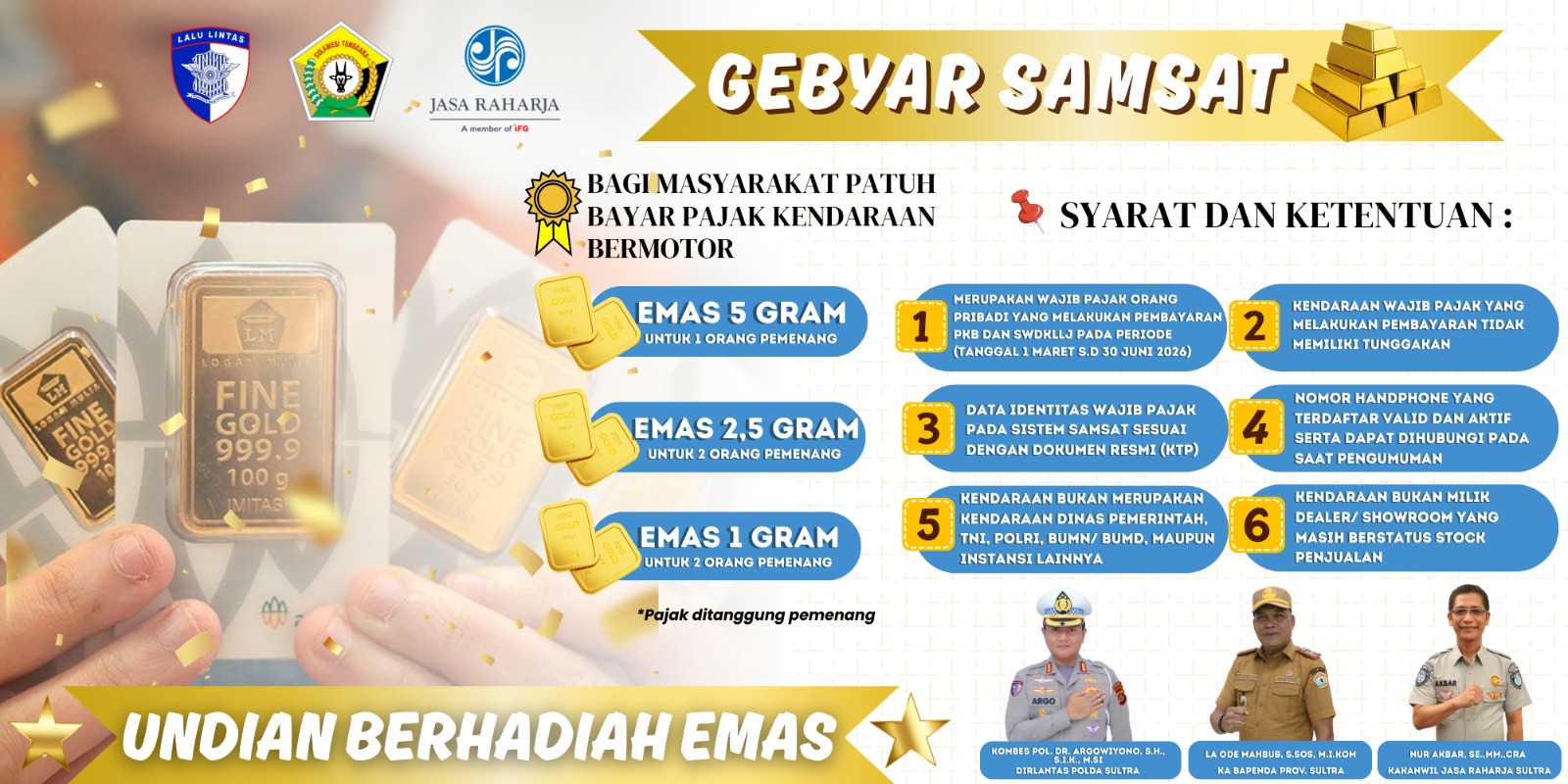 Pemenang undian emas ini rencananya akan diumumkan pada Juli 2026. Bagi warga Sultra, segera kunjungi kantor Samsat terdekat atau gunakan aplikasi Samsat Digital sebelum periode berakhir pada 30 Juni mendatang.
