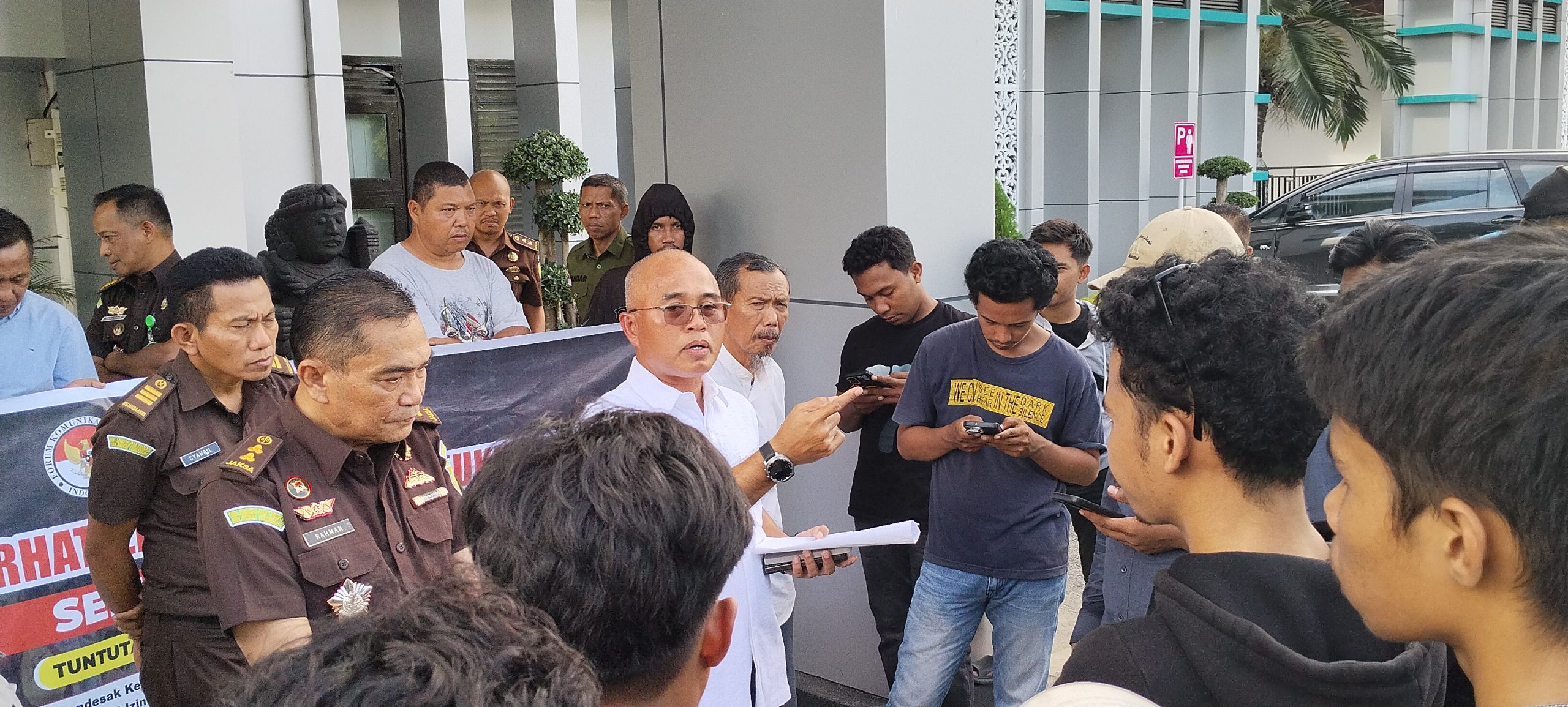 Asisten Intelijen (Asintel) Kejati Sultra, Muh Ilham, saat menemui massa, menjamin profesionalitas penyidik.