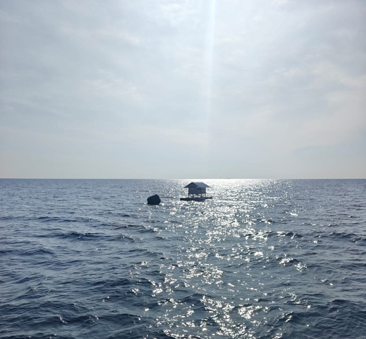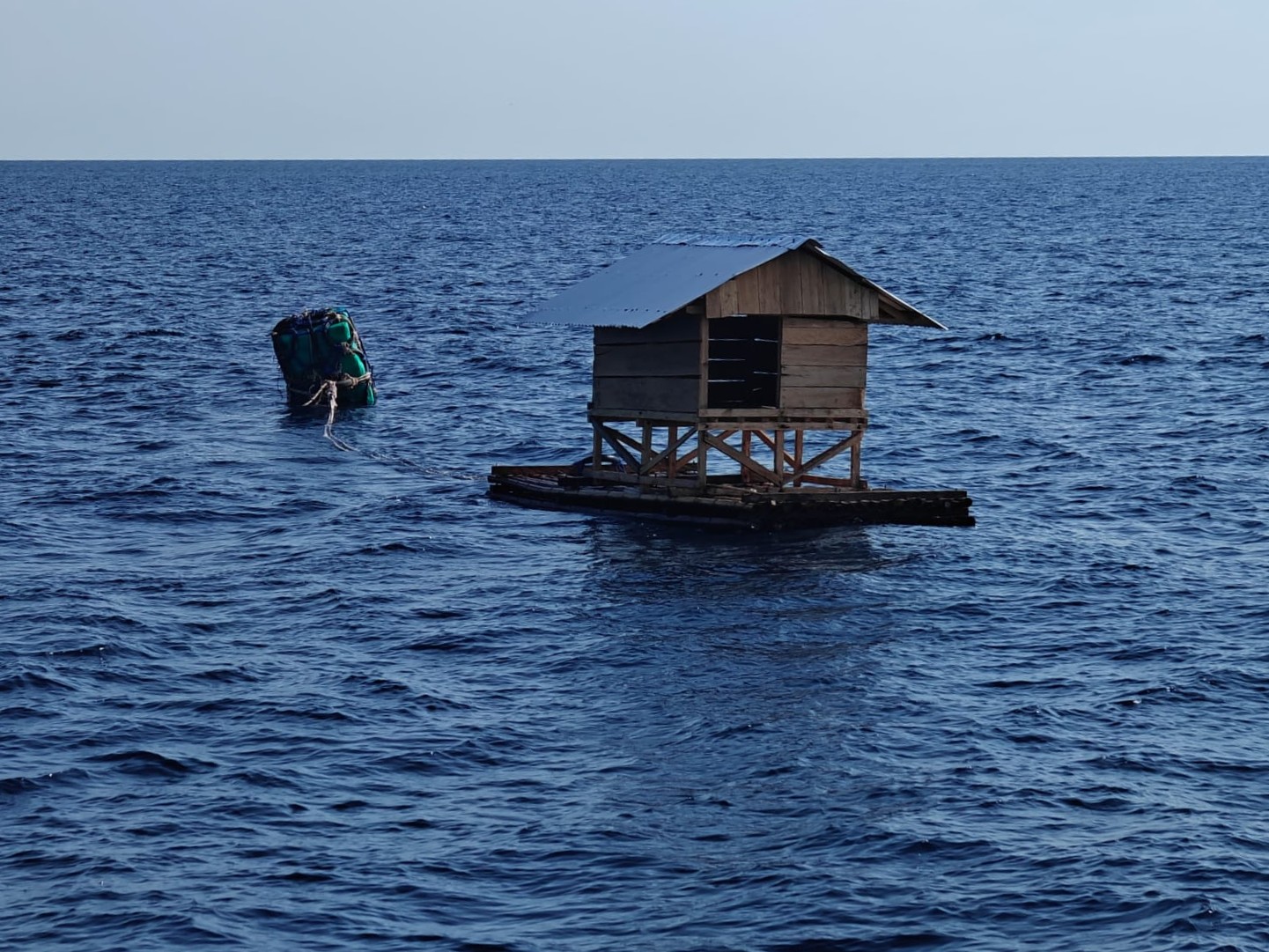 Di sekelilingnya, ombak bergulung pelan, sementara sebuah pelampung besar terikat tak jauh dari struktur tersebut.