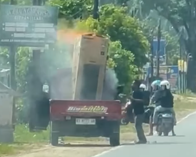 Dalam rekaman video, terlihat api berkobar dari kotak kardus kulkas yang diletakkan di bak belakang mobil pikap berwarna merah. Kulkas yang terbakar bahkan sempat terjatuh ke badan jalan. Asap tebal yang mengepul menyebabkan sejumlah pengendara yang melintas harus memperlambat laju kendaraan mereka.