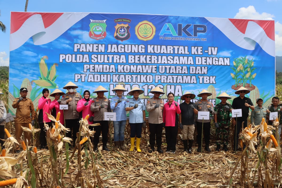 Panen raya jagung Kuartal ke-IV di lahan seluas 126 hektare di Desa Tambakua, Kecamatan Landawe, Kabupaten Konawe Utara (Konut), menjadi penanda keberhasilan sinergi tiga pihak yakni Polda Sultra, Pemerintah Daerah Konut, dan PT Adhi Kartiko Pratama Tbk (AKP).