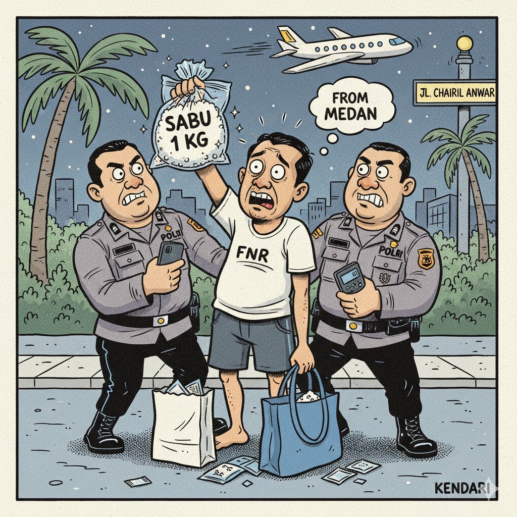 KENDARI, — Satuan Reserse Narkoba (Sat Resnarkoba) Kepolisian Resor Kota (Polresta) Kendari berhasil menggagalkan upaya peredaran narkotika jenis sabu dengan berat bruto lebih dari 1 kilogram. Seorang pria berinisial FNR (33) ditangkap di Jalan Chairil Anwar, Kelurahan Watulondo, Kecamatan Puuwatu, Kota Kendari, pada Senin (20/10/2025) malam.