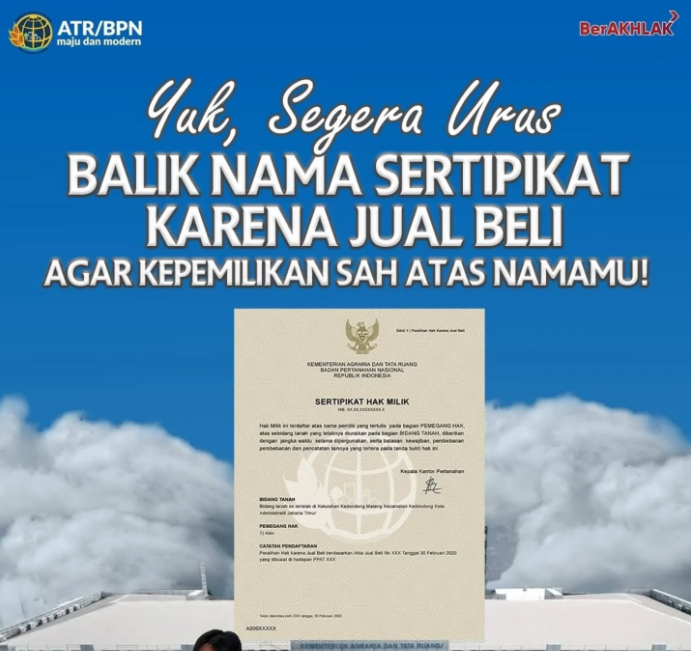 “Segera urus balik nama sertipikat karena jual beli agar kepemilikan sah atas namamu,” tulis pesan edukasi resmi tersebut, dikutip Rabu (1/4/2026).